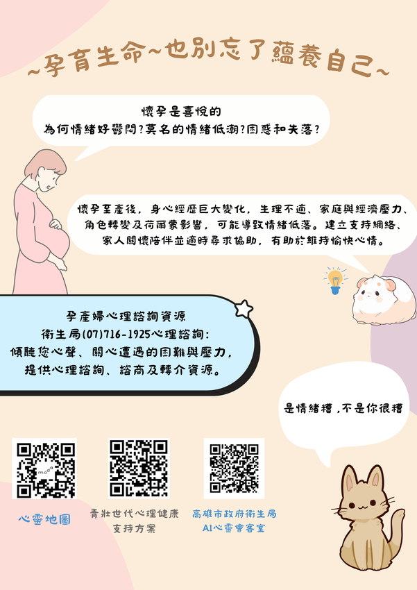 孕產婦關懷網站:https://mammy.hpa.gov.tw/婦女心理健康促進:https://dep.mohw.gov.tw/domhaoh/lp-4908-107.html