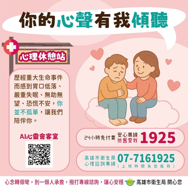 一、衛生福利部安心專線1925(依舊愛我):提供全年無休、24小時免費心理諮詢服務。